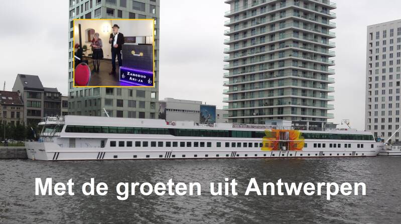 Een foto van het vakantieschip de Zonnebloem in de haven van Antwerpen waar het zangduo diverse keren optrad. Net als in vele zalen voor diverse afdelingen van de Zonnebloem in Nederland